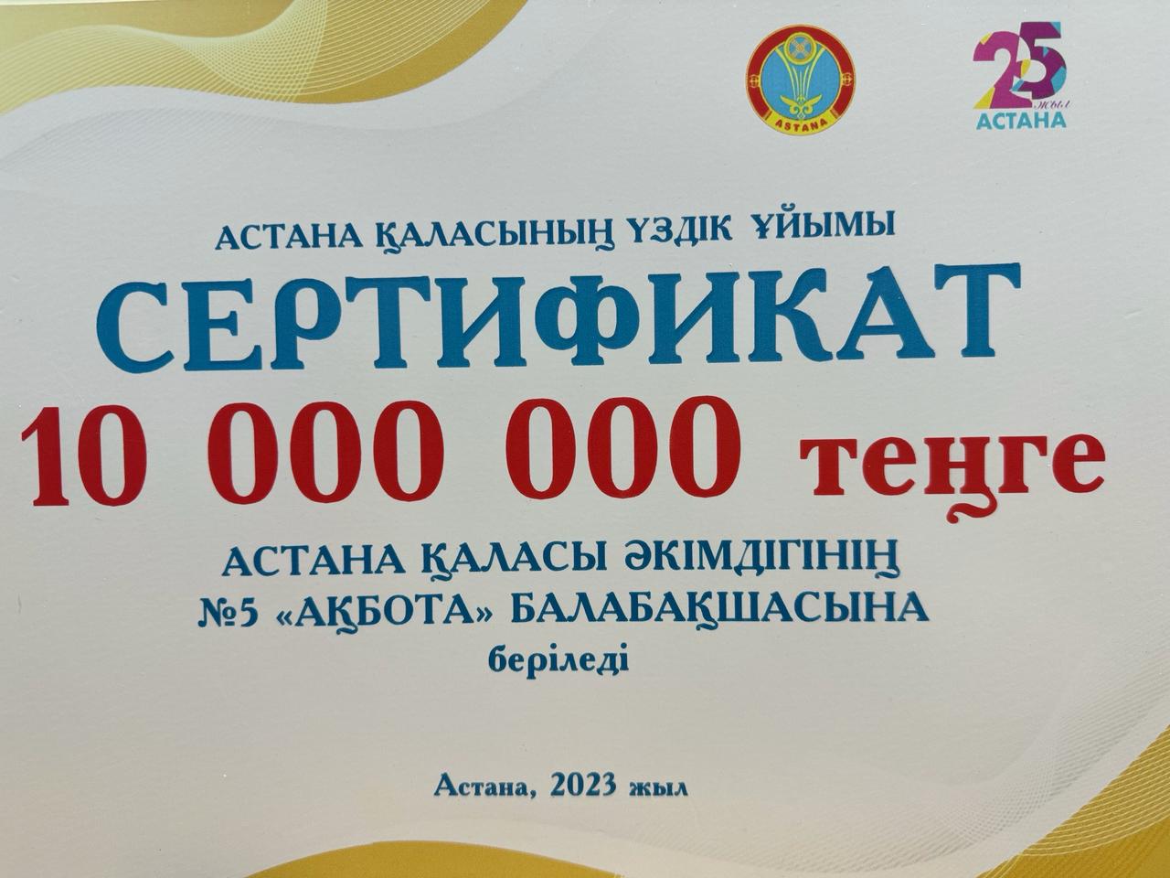 2023 жылы 5 “Ақбота” балабақшасы - Астана қаласы бойынша ең үздік балабақша атанып, “Үздік ұйым-2023” номинациясымен Астана қаласы әкімінің 10 000 000 грантын ұтып алды.